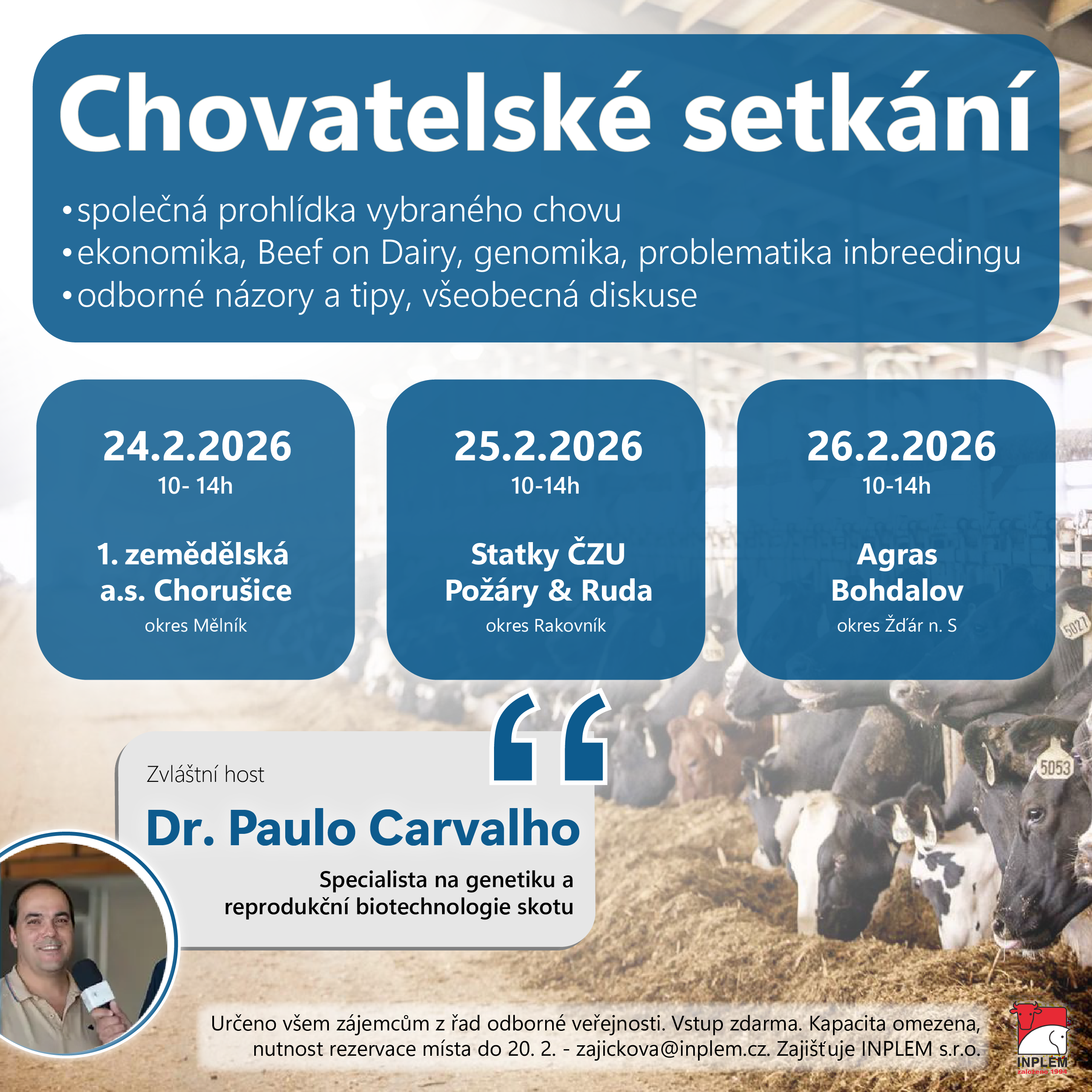 Přijměte naše pozvání k neformálnímu setkání šlechtitelů a chovatelů, kde bude příležitost projít si a prohlédnout si tři TOP stáje v rámci České republiky, prodiskutovat v menším kolektivu různá témata, získat inspiraci a nasát nové impulsy, dozvědět se něco o ekonomicky efektivních cestách managementu stád.