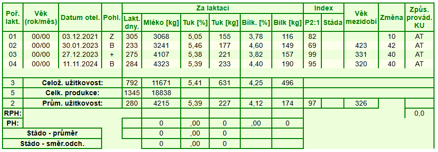 matka na 4. laktaci 15,3 kg, T% 5,39, B% 4,40
