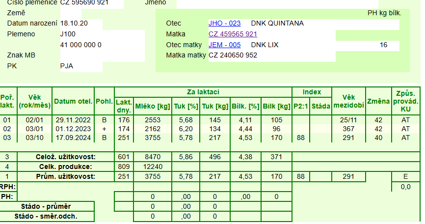 matka na 3. laktaci 15 kg, T% 5,78, B% 4,53