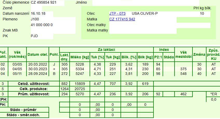 matka na 3. laktaci 19,3 kg, T% 4,33, B% 3,92