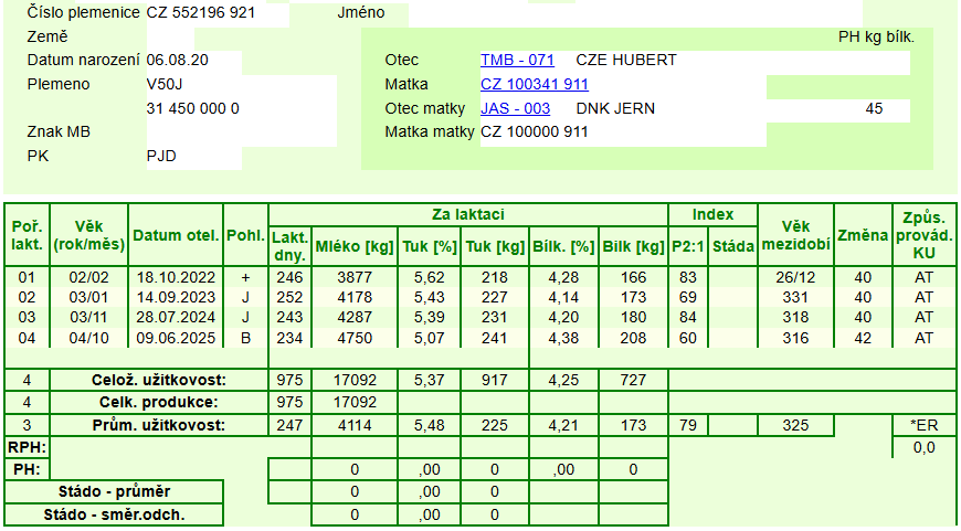 matka na 4. laktaci 20,3 kg, T% 5,07, B% 4,25