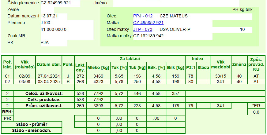 matka na 2. laktaci 16,3 kg, T% 5,78, B% 4,58