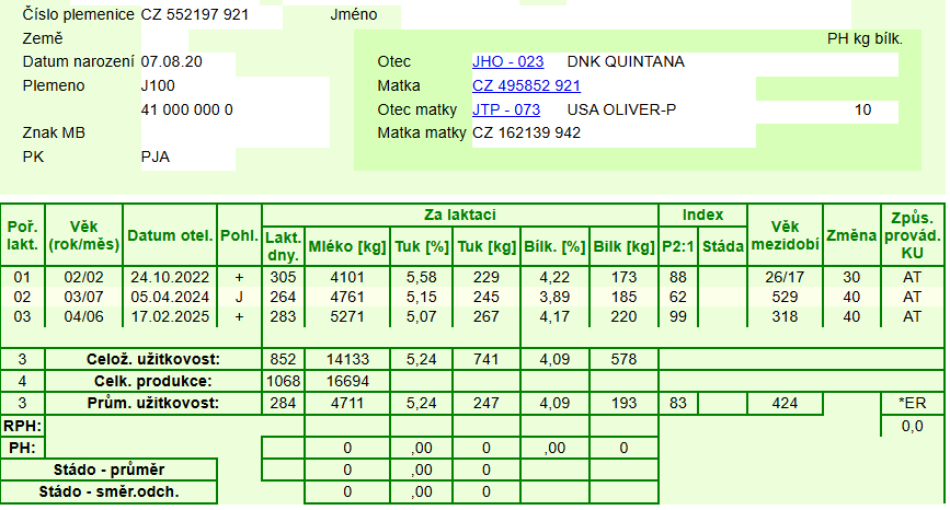 matka na 3. laktaci 18,6 kg, T% 5,07, B% 4,17